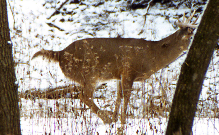 With all four hooves on its ground scrape, this buck is pressing its tufted tarsal glands together (located on inner surfaces of its hind legs) to squeeze out musk. The buck is also urinating over the surfaces of these glands to carry the musk to the ground. Some bucks do what appears to be a hula dance while doing this to squeeze additional musk from their tarsal glands. Dominant bucks also rub acrid scalp musk oozing from glands slightly below the bases of their antlers on overhanging branches. The primary purpose of this is to mark its breeding range with easily seen, easily smelled markers that warn other bucks to keep away. All antlered bucks do this before breeding begins but within a short period of time, dominant bucks temporarily evict all other antlered bucks from their breeding ranges to assure exclusive breeding of does in heat.