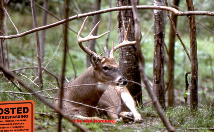 Mature whitetails also quickly recognize differences between hunting and non-hunting humans. When harmless humans they have often observed throughout the year suddenly don blaze-orange clothing and begin sneaking into their ranges, often halting to peer about and listen, or when humans form long lines that attempt to drive them toward waiting lines of downwind humans, they instantly begin taking previously effective precautions. Though conservative at first, as soon as it becomes obvious it will thereafter be difficult to avoid short-range encounters with hunting humans, they readily abandon their home or breeding ranges for extended periods, not uncommonly taking refuge several miles away on posted property or in habitat seldom invaded by hunters such as wooded swamps. Older wolf-country bucks I have studied were knowledgeable of safe sites in areas as large as a township (36 square-miles). Many experienced deer simply become nocturnal when threatened by hunters, stubbornly refusing to leave their secluded beds within their home or breeding ranges during daylight hours.