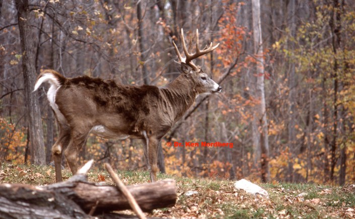 This is a great photo of a dominant breeding buck in his prime. Unfortunately, this buck was killed by a poacher. Note his arched tail, his enlarged neck, and the wrinkles on his neck. That wrinkling is caused by fluid from scalp musk. Note the enlarged tarsal gland on the inside of his left rear leg — with its tuft of white hair.
