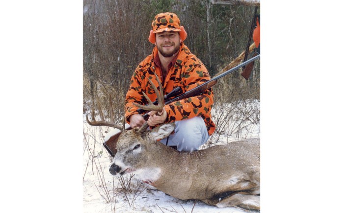 The fifty-yard-long section of an old logging trail not yet taken over by the surrounding forest reeked with signs of a big buck. In deep grass at the center was a freshly renewed, six-foot diameter ground scrape with clumps of sod scattering up to ten feet away on one side. Two trails intersecting near the scrape were deeply pockmarked with fresh, four-inch-long deer tracks and scattered clumps of shiny inch-long droppings. A bright, four-inch-diameter antler on an aspen at one end of the opening and a six-inch-diameter rub on a pine near the other end made it obvious this secluded deepwoods hideaway was much coveted by an enormous buck. At 9:45 AM two weeks later a 300-plus-pound 12-pointer emerged from the dense evergreens on the left side of the opening and halted next to the scrape. My neck shot dropped it in its tracks.
