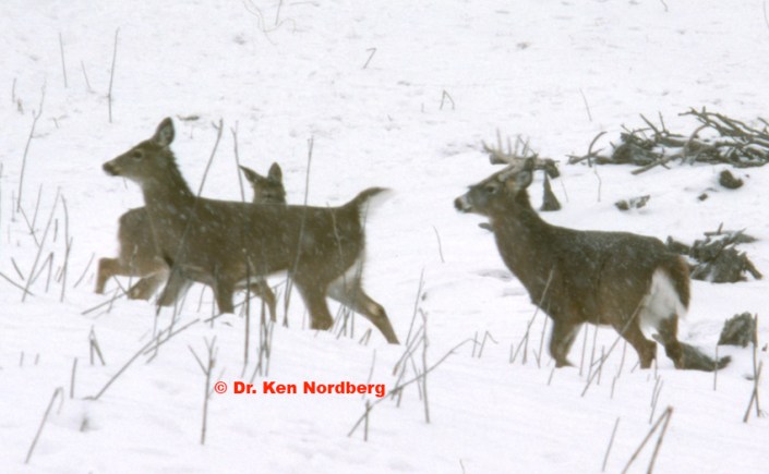 2. larger tracks of a mature buck accompanying smaller tracks of a doe,